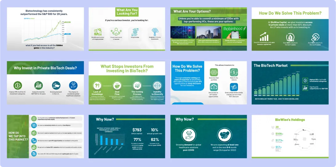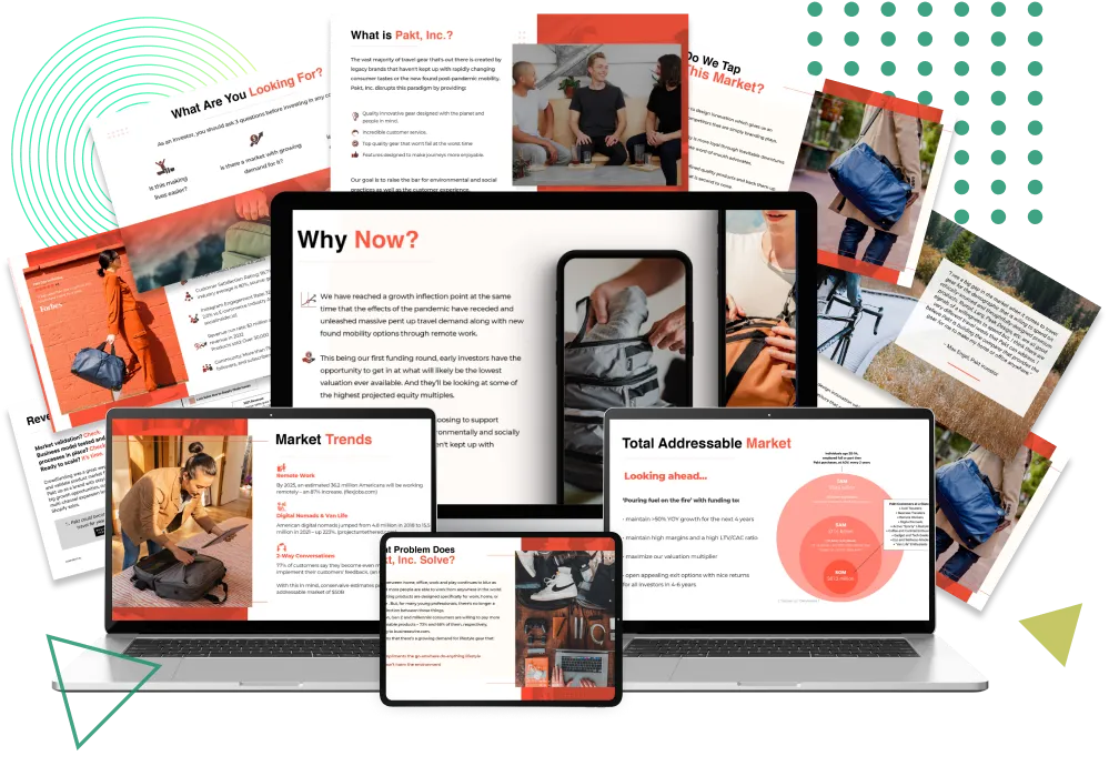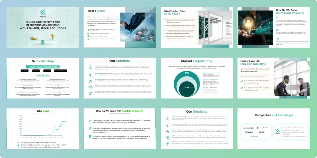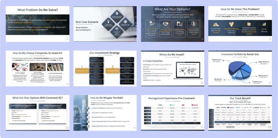 Our decks are systematically designed to tell your story, answer investor objections, and present data in an easy-to-understand, professional manner: arguing a compelling case for your company so you can secure the funding you need.